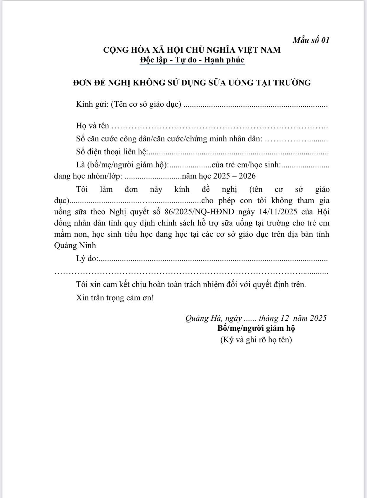 - Trường hợp trẻ không uống được sữa, cha mẹ vui lòng làm Đơn đề nghị không cho trẻ uống sữa tại trường (theo mẫu đính kèm) và nộp cho giáo viên chủ nhiệm trong ngày 25/12/2025 (Thứ Năm).