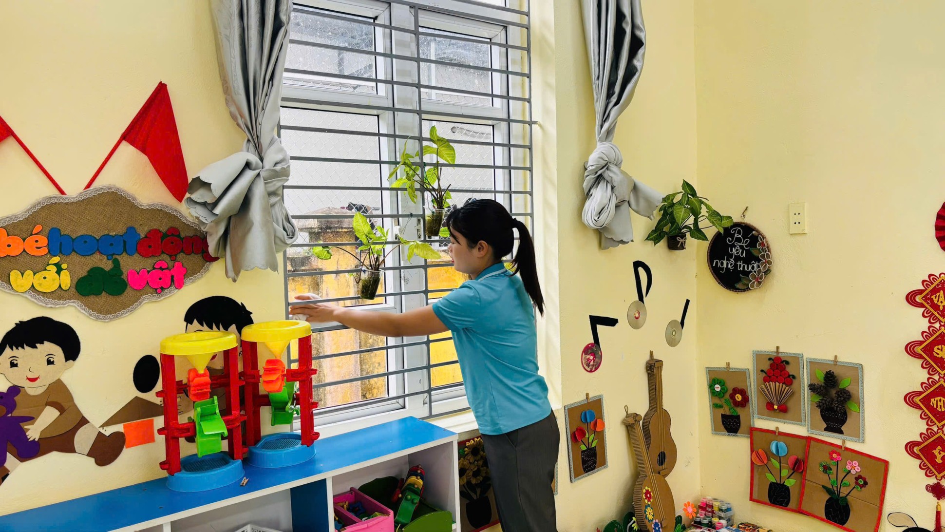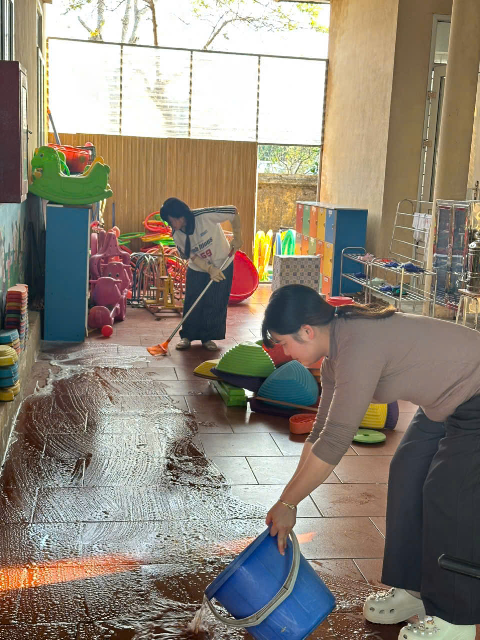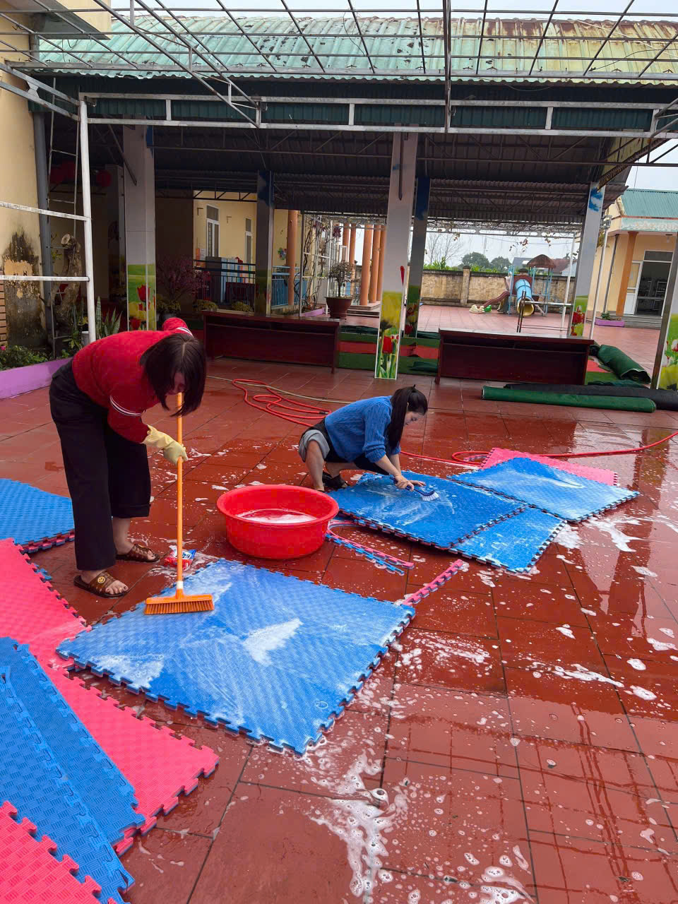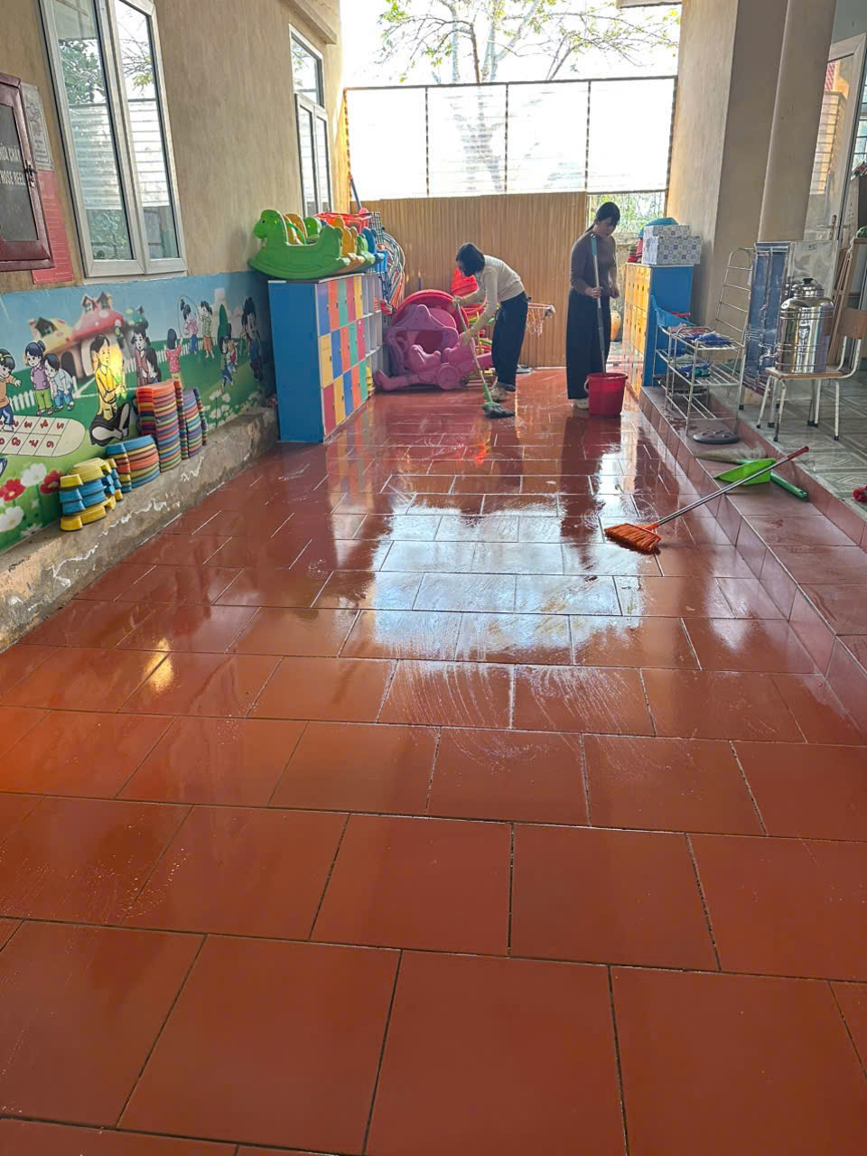 Các phòng học được lau chùi bàn ghế, tủ kệ, đồ dùng – đồ chơi; khử khuẩn sàn nhà, tay nắm cửa, lan can cầu thang. Khu vực sân trường, vườn cây, khu vui chơi ngoài trời được quét dọn sạch sẽ, sắp xếp gọn gàng, đảm bảo an toàn cho trẻ khi tham gia các hoạt động vận động.