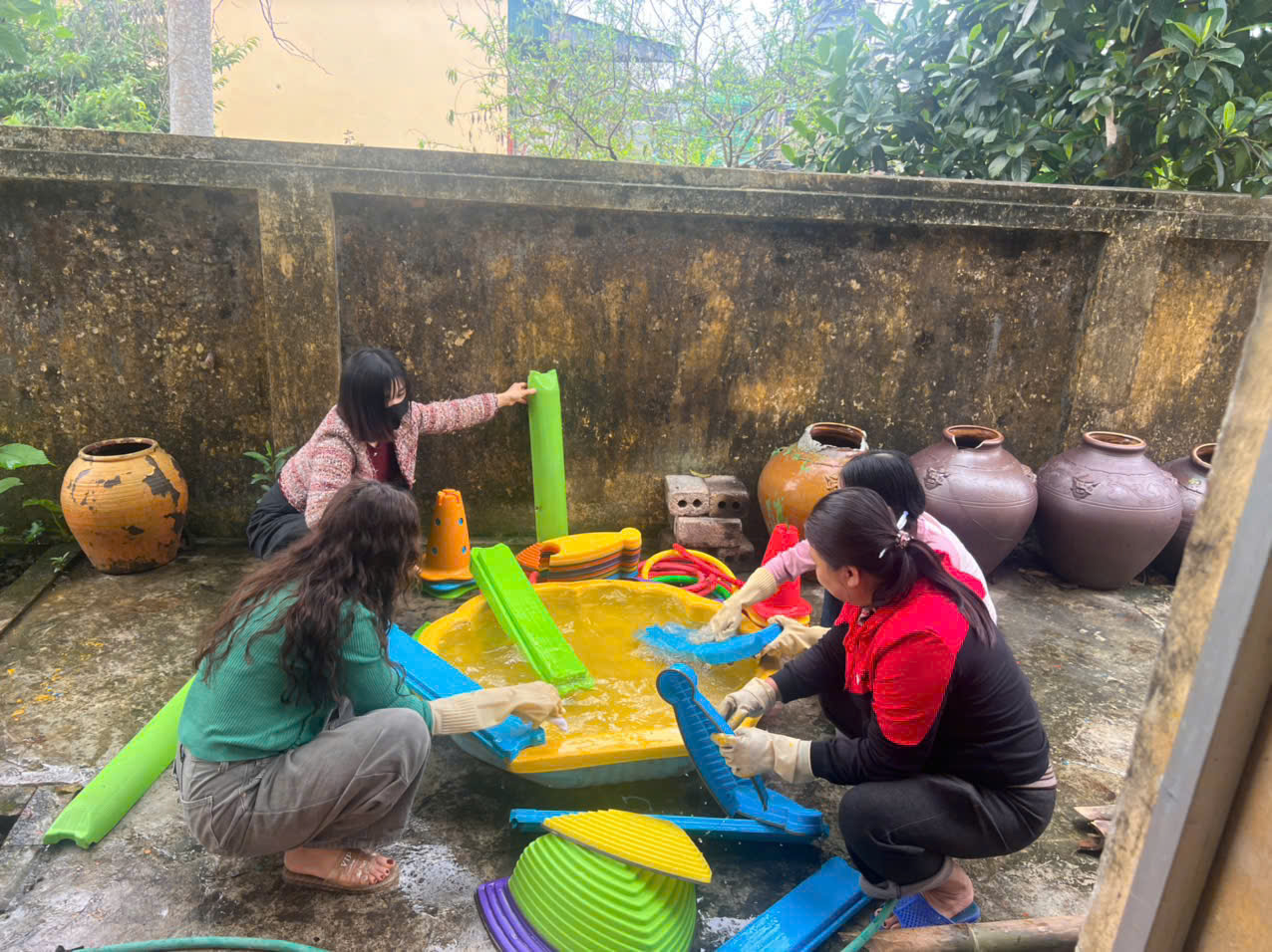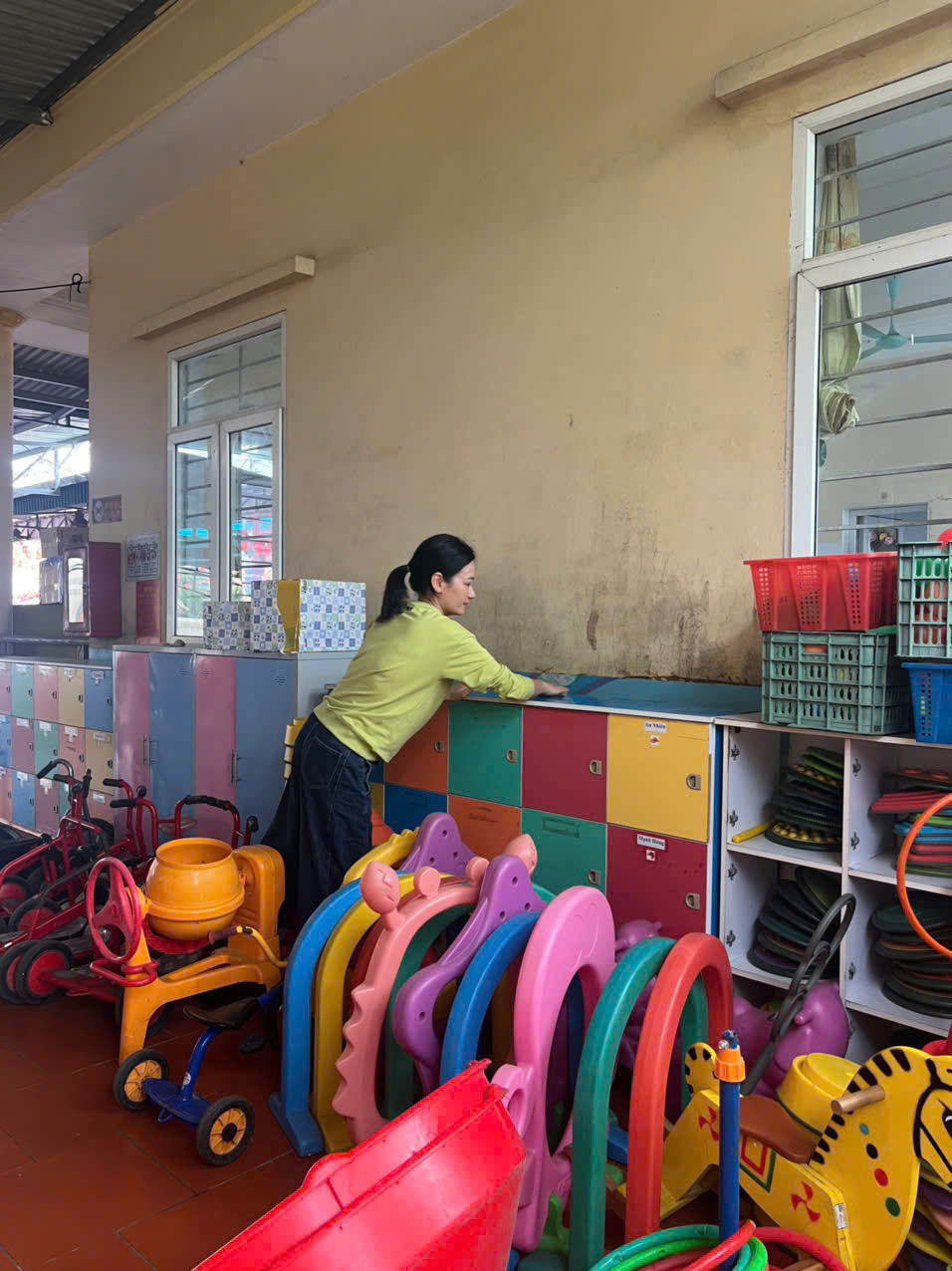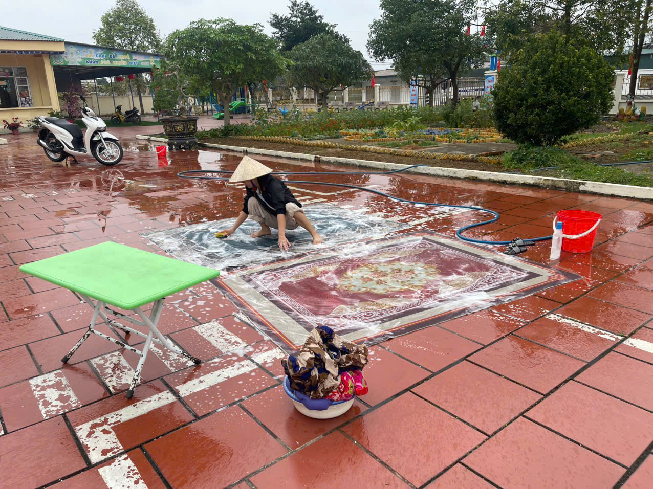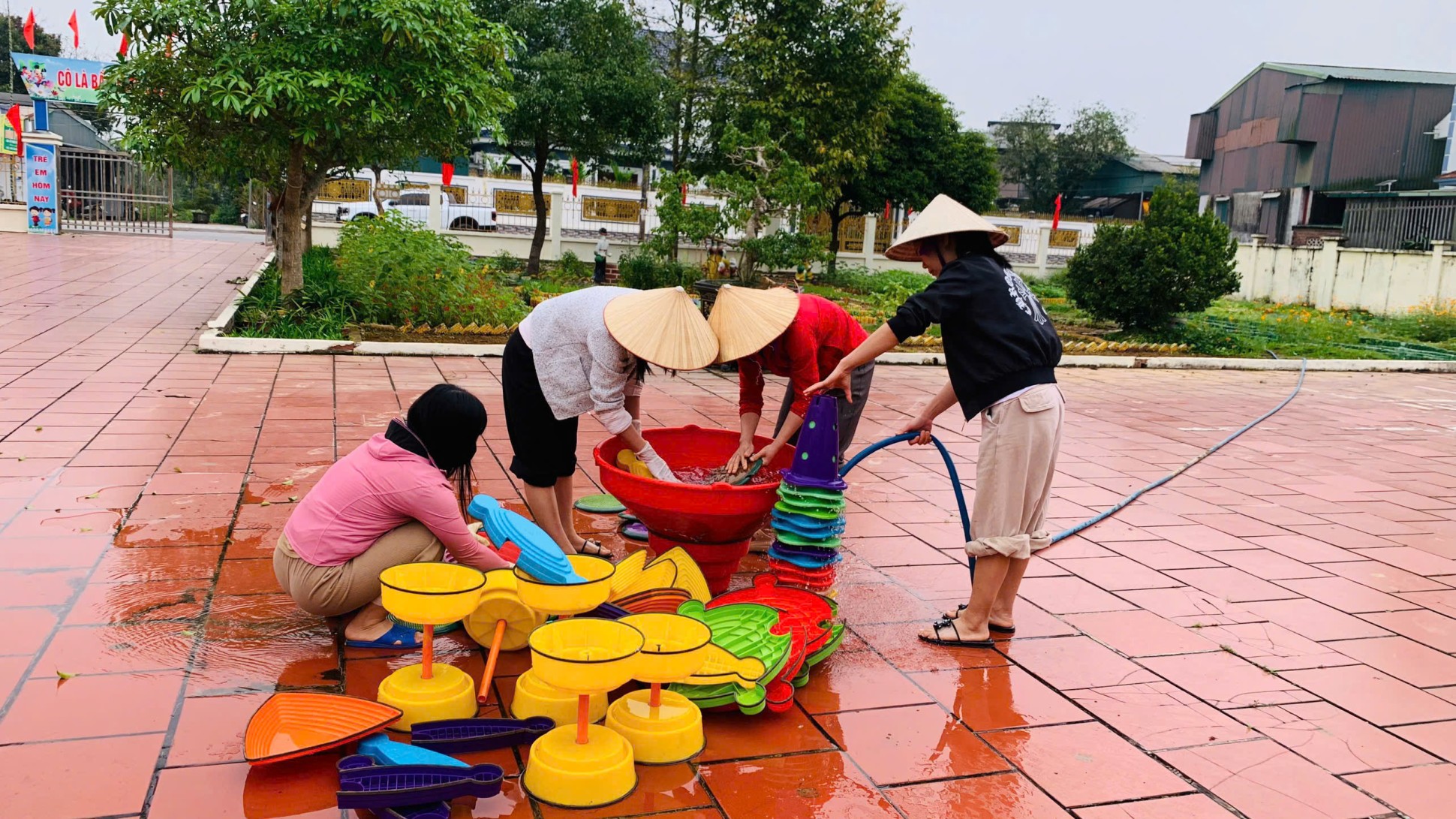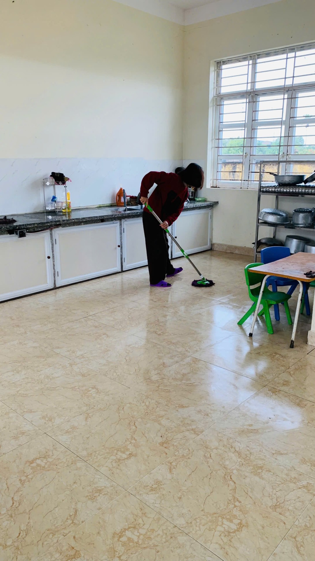 Các phòng học được lau chùi bàn ghế, tủ kệ, đồ dùng – đồ chơi; khử khuẩn sàn nhà, tay nắm cửa, lan can cầu thang. Khu vực sân trường, vườn cây, khu vui chơi ngoài trời được quét dọn sạch sẽ, sắp xếp gọn gàng, đảm bảo an toàn cho trẻ khi tham gia các hoạt động vận động.